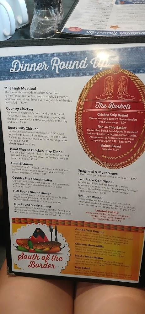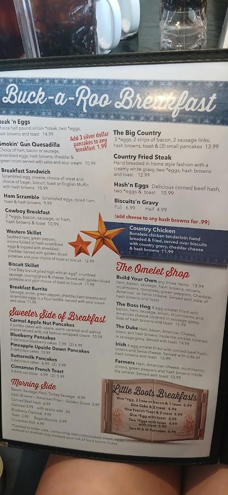 The menu at Little Boots Country Diner features classic American dishes served with a twist. Breakfast items are beloved, including the Breakfast Burrito and Carmel Apple Pancakes. Lunch and dinner showcase hearty options like Country Fried Steak and BBQ Chicken. Healthier choices are also available, ensuring everyone finds something to enjoy. The kids' menu is a bonus for families. Desserts are homemade and a sweet finish to any meal. Expect generous portion sizes that leave diners satisfied.